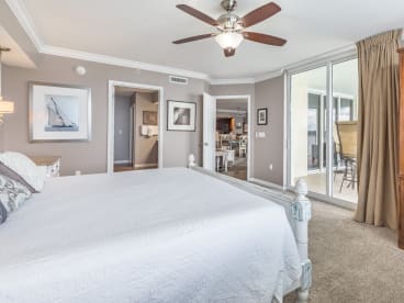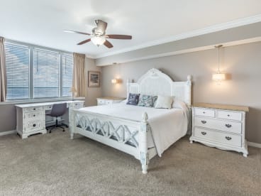 -MASTER SUITE includes huge Master bedroom with large desk under the window overlooking the bay, king-size bed with high-end mattress, TV, and sliding glass doors connecting to the balcony.