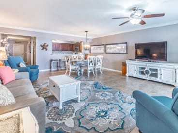 This was a great place to stay with lots of room and great views of the bay from the balcony and master bedroom at a price that’s very reasonable. Very clean and stocked with all the amenities needed in the kitchen and laundry. Large balcony with a dining table and seating area. Very close to lots of restaurants and shopping. There is a Publix just a few minutes away. There is covered parking when available and we were always able to park in the coverage garage. Water recreational rental right next door to the complex with jets skis and pontoon boats. The beach was across the street from the complex, but has a walkway to avoid the street. The complex has a clean pool with lazy river with a attendant making sure you have a wristband from the complex. We did see some bbq cooking areas also with picnic tables not far from the pool. Overall a wonderful place to stay with lots of room and close to everything Ft. Walton/Destin.