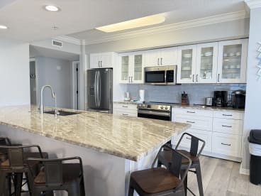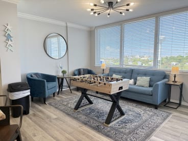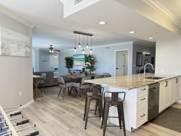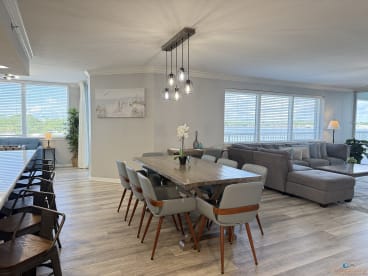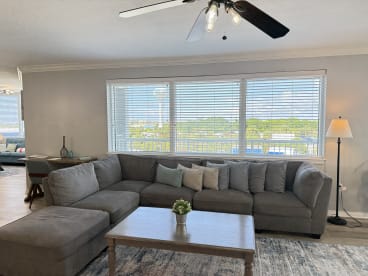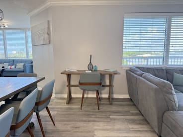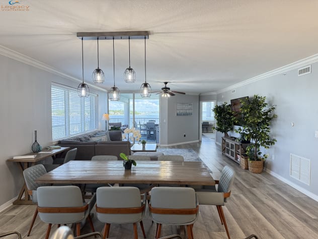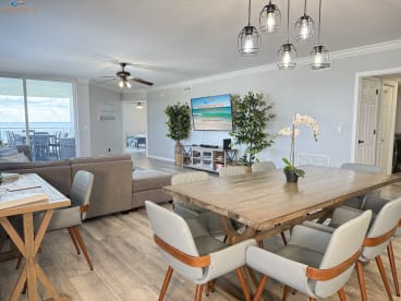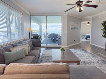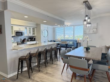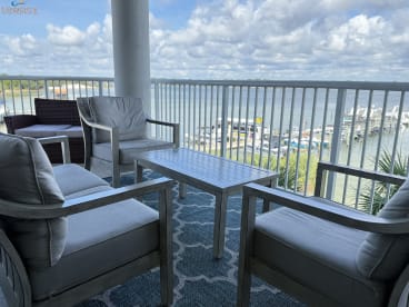Stunning renovated condo with sweeping corner views, modern kitchen, and 5-star luxury bathrooms! Relax and spread out in this 2400+ sqft condo, with 600 sqft of private balcony directly on the Bay. Lazy Heron Hideaway (Heron 401) is a corner unit offering beautiful views from the spacious balcony and light-filled windows. Enjoy the lazy river just downstairs, stroll over the walkway to the beach, and then relax and enjoy the sunset from your private balcony overlooking the Choctawatchee Bay.Beach Service (1 umbrella, 2 chairs set up for you daily) Is complimentary with your stay!