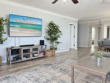 Each of the three bedrooms is furnished with a king bed, with one of the bedrooms additionally having built-in bunk beds. Two rollaway beds are also provided for added flexibility. In addition to the main living area, a second living area offers a queen sleeper sofa.