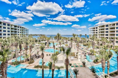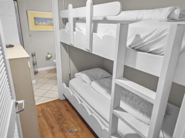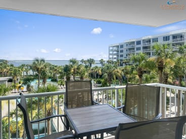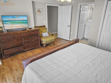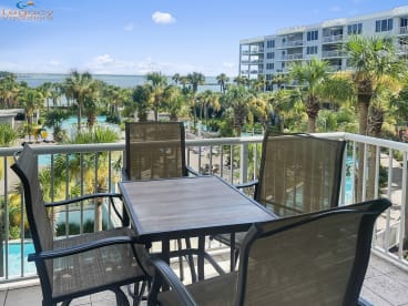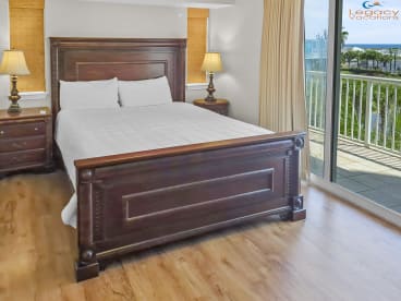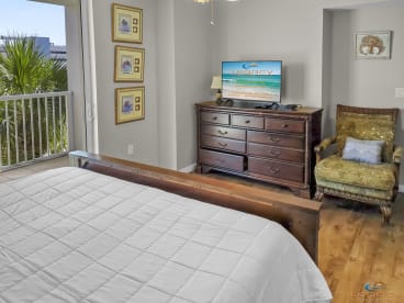 Great location! Newly furnished one bedroom unit with a separate bunk room. Directly looking over the lazy river with front views of the bay and a private back balcony off the Master bedroom with views of the gulf.The Master bedroom has a triple dresser with a large flat screen tv, a king bed with top of the line mattress and linens and a private bath.
