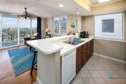 The kitchen is fully stocked with everything you will need for that stay away from home. It also features great views of the bay.