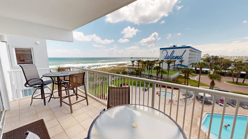The private balcony offers views of the white sands and emerald greens waters just a short walk away. As well as offering views of the complex pools.