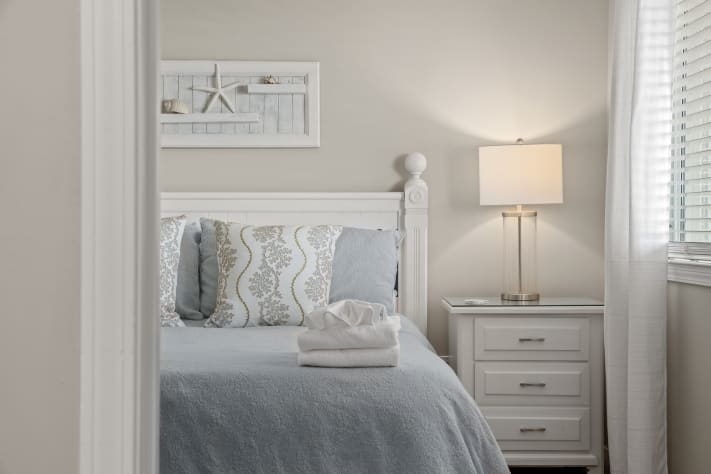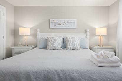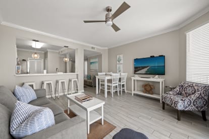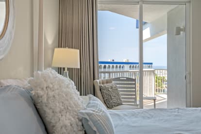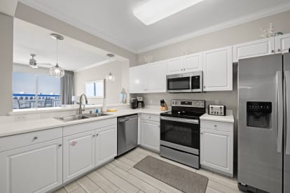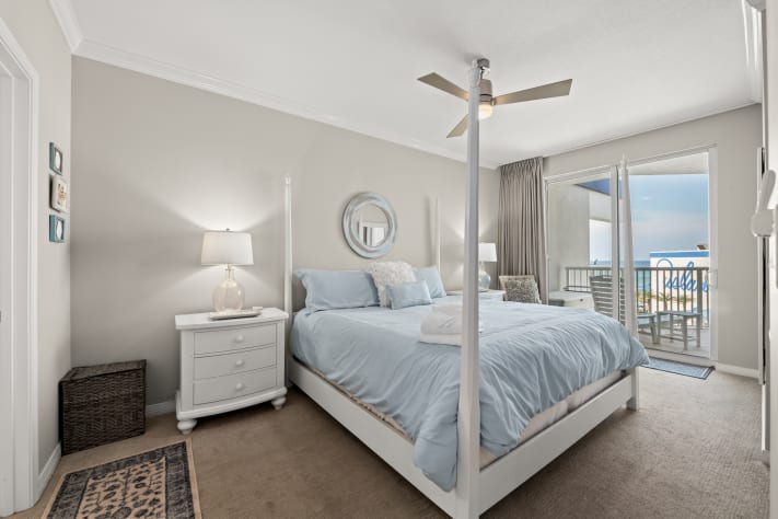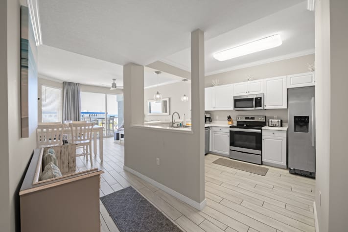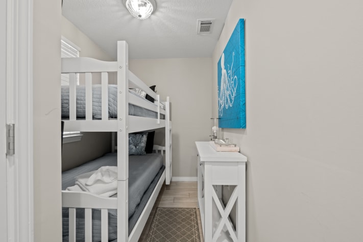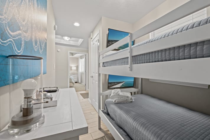 This distinct residence sleeps a total of eight guests and features a king-size bed in BOTH the master bedroom AND the guest bedroom, a bunk room that sleeps two with flat-screen smart TVs for streaming, and a brand-new queen-size sleeper with a comforter set and comfortable memory foam mattress! There are two full bathrooms: the master has both a shower and tub and the guest bathroom has a large, walk-in shower. The very generous and comfortable living room includes a large, brand-new flat screen smart television and access to a large, private deck, perfect for dinner, drinks, and those beautiful gulf side evenings. The condo also features a large chef's kitchen with a breakfast bar, stainless steel range, microwave, refrigerator and dishwasher, toaster, blender and coffeemaker, and all the amenities of home! The large master and guest bedrooms both feature king beds and flat-screen smart TVs with cable! The condo also comes with free Wi-Fi and a COMPLIMENTARY BEACH SERVICE March through October!