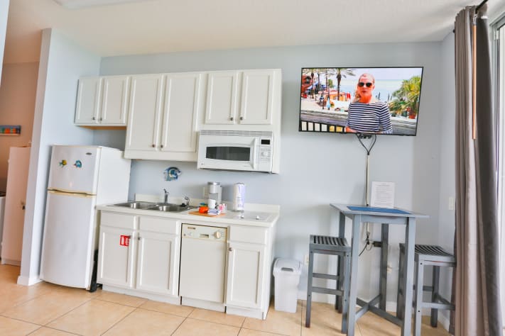 The kitchenette is equipped with the essentials you need for preparing light meals and snacks, including a mini-fridge, microwave, and countertop appliances — ideal for quick breakfasts before the beach or easy dinners after a day in the sun.